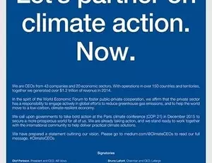 CEOs from 43 leading international groups in 20 different sectors with operations in over 150 countries, jointly generating over $1.2 trillion dollars in revenue in 2014, are launching a joint initiative to lay down the bases for a global and responsible agreement on the climate, at the COP21 in Paris in December 2015.